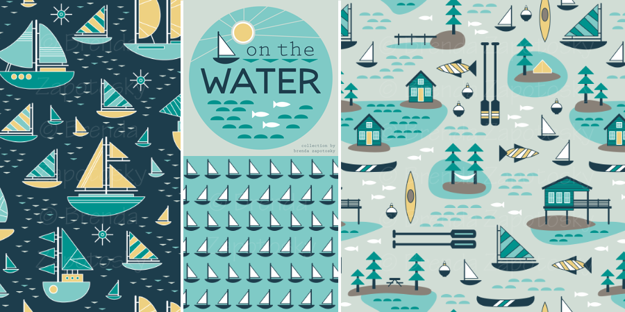 A selection of surface pattern collections, stationary goods, and my designs on fabric and sewn goods.