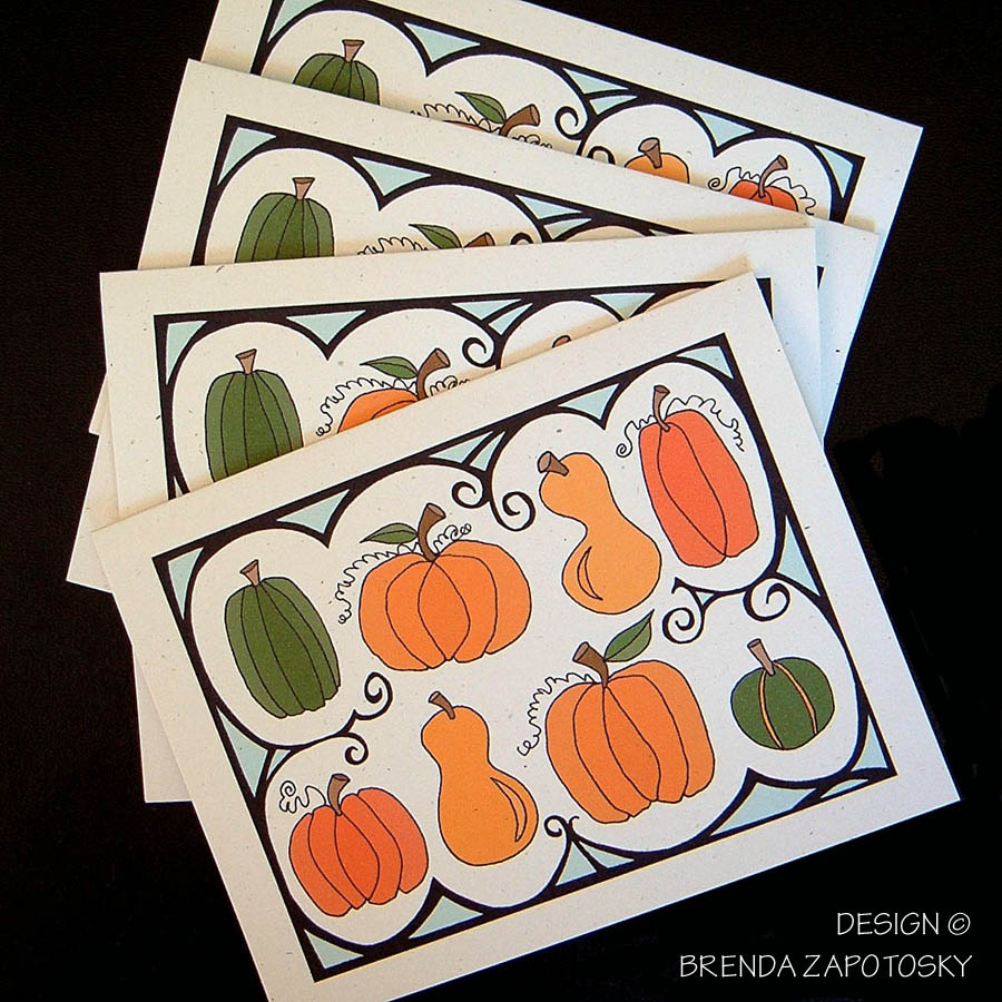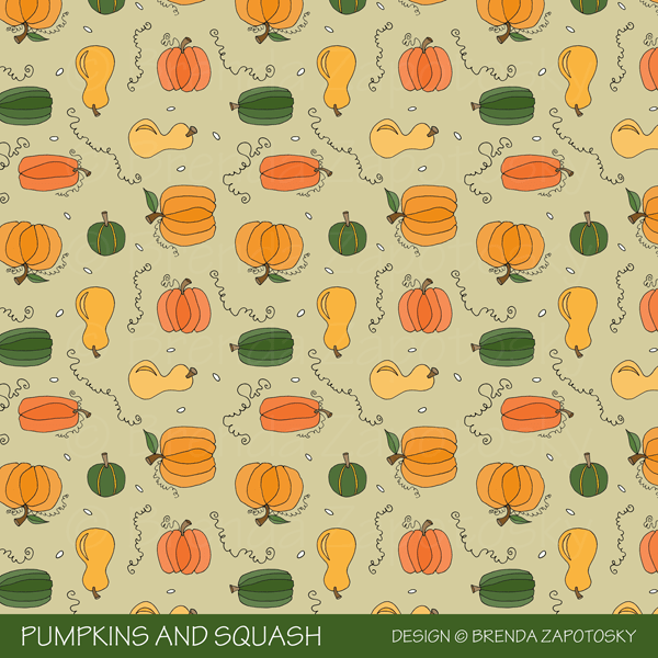 One of the designs in that Collection and actually one of the very first patterns I ever uploaded to Spoonflower is my Pumpkins and Squash Design. This one I adapted from a note card I designed.