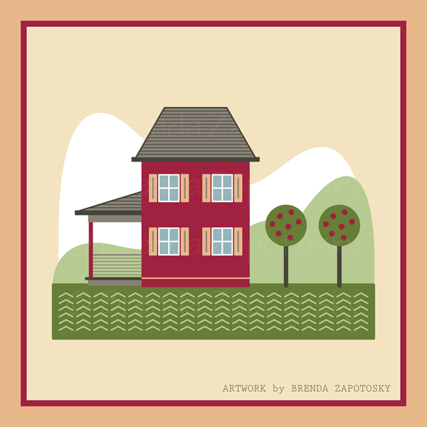 In keeping with my running theme of buildings/houses that are seasonal for each month, I chose to do a Valentine themed rendition of a home inspired by my paternal grandparent’s house which held a lot of fond memories for me. While there are several houses I could have chosen, I thought the base look of this one fit a “heart” cottage theme well. This is a great blend of my architecture and illustration selves with the high detailing of the house mixed with the playful whimsy of the Valentine elements.