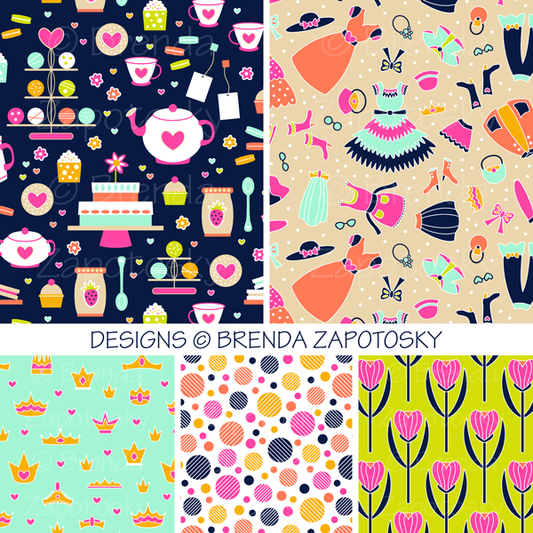 Playtime Tea Party features whimsical prints inspired by imaginary tea parties and dress up fun! All my designs can be found together in one COLLECTION in my shop. I already have a second colorway in the works and an additional design which will be added to it over time. The designs can also be found in various collections elsewhere on Spoonflower where they are grouped with all the other designer’s patterns.