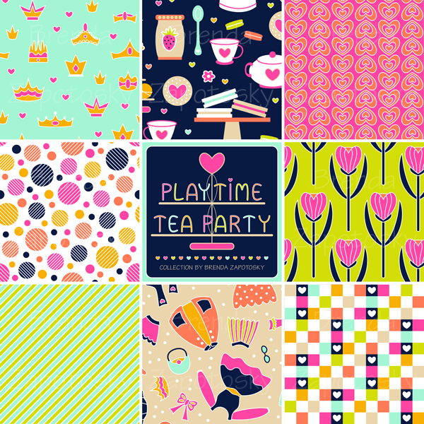 Once we finalized the colors we moved on to the design phase! While technically this is our Spring Release Collection we did not have to create solely spring themed designs. Since these colors were so bold and playful (and slightly girly) I drew inspiration from my 6 year old niece and designs I thought she would love.. Some brand new and some a new color version of older designs (from several different collections). My collection is called PLAYTIME TEA PARTY!