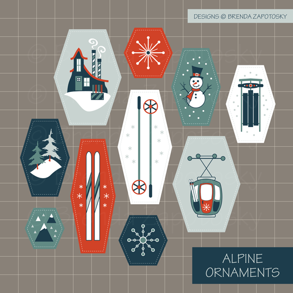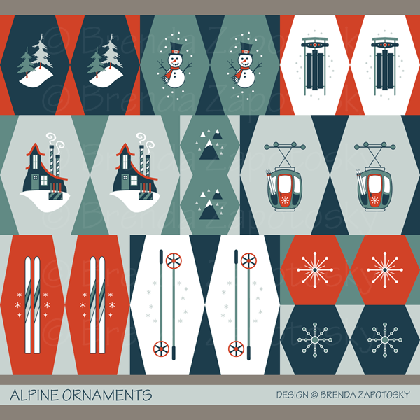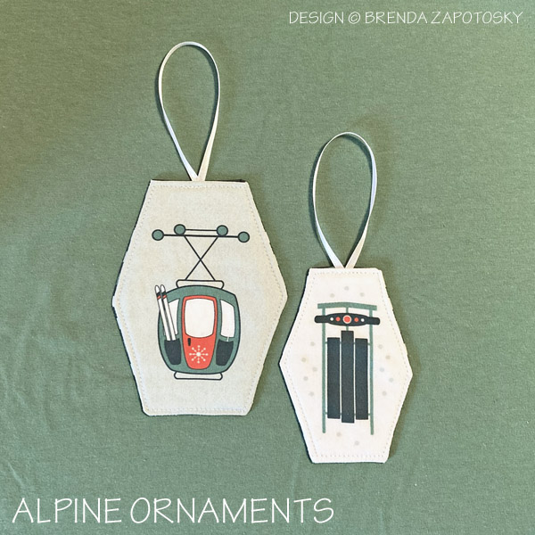 Here is a look at the design: ALPINE ORNAMENTS CUT AND SEW in the Classic colorway. The design is 21″ wide which will work on ALL fabric types, including Petal Cotton. If you purchase a wider fabric you may get a few extra ornaments from your cut! There are duplicates of every design giving you two options. You can buy just this fat quarter and make 10 two-sided ornaments OR you can pair this fat quarter with an additional fabric and get 20 ornaments. I have many coordinating patterns in my Alpine Classic Collection or you can use something from elsewhere. I used the STRIPE on the top left of the image below to back mine.