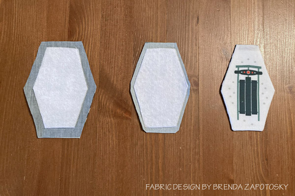 Cut 1 fusible fleece hexagon for each ornament 3/8″+ smaller on every side.